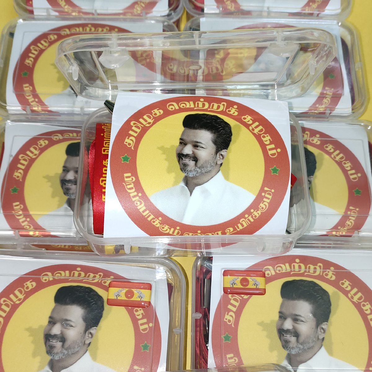 In All Product Printed Tvk Party Name with Vijay Photo.