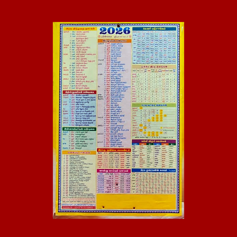 Back: Detailed Panchangam with daily Tamil year, month, nakshatra, thithi & auspicious timings.